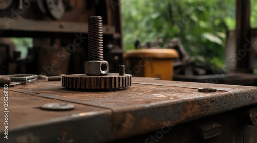 gear, mechanism, machine, workshop, metal, rust, tool, industrial, part, equipment, closeup, surface, old, vintage, factory, engineering, hardware, bolt, nature, background, green, repair, workstation, craftsmanship, detail, circular, assembly, process, environment, device, technology, maintenance, strength, performance, structure, knob, layout, functional, close, material, industry, production, artisan, component