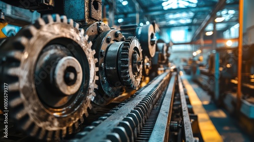 Close-up of industrial gears and machinery in a factory setting, showcasing mechanical precision and engineering design.