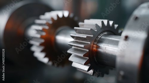 Close-up of industrial machine gears interlocking in vibrant metal mechanism with sharp details