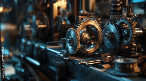 Close-up of industrial machinery with gears, tools, and mechanical components in a factory