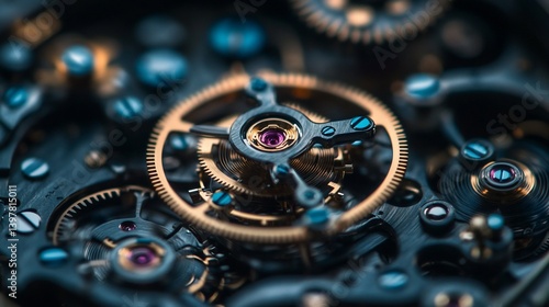 clock, gear, mechanism, watch, time, intricate, detail, precision, engineering, machinery, technology, complex, movement, cog, wheel, metal, gold, blue, screw, part, antique, vintage, craft, artistry, design, luxury, elegance, sophisticated, delicate, assembly, component, machine, apparatus, system, device, instrument, artifact, object, background, texture