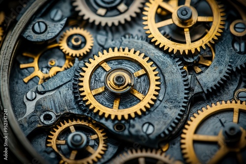 Close-up of Intricate Gold and Black Gears Interlocking