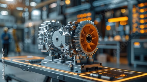 Close-up of intricate industrial machinery component on a display table within a factory setting.