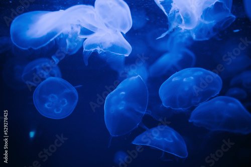 jellyfish, closeup, blue, fish, undersea, ocean life, animal, motion, nature, underwater, water, semitransparent, group, transparent, wildlife, nobody