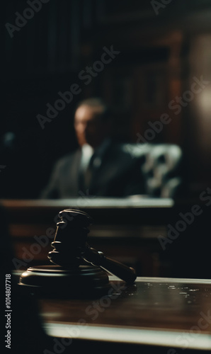 close-up of judge gavel in focus, with blurred figures in background, judging hammer symbolizing justice, authority, and seriousness of courtroom proceedings law concept