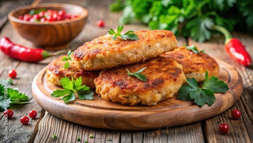 Close-up of juicy chicken cutlets made from minced meat with paprika, placed on a wooden cutting board and garnished with fresh parsley, kitchen scene, paprika