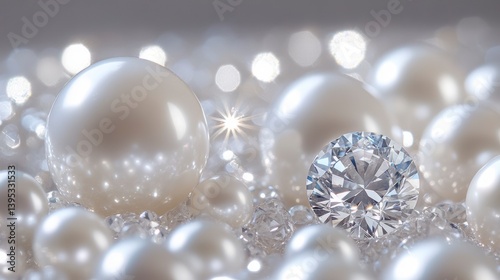Close-up of lustrous pearls and a brilliant diamond, sparkling with soft light.