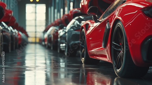 Close-up of luxury sports cars lined up, focusing on the sleek design and premium quality. Ideal for automotive and luxury vehicle visuals.