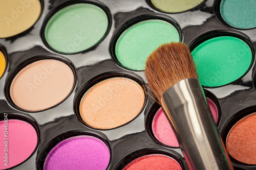 Closeup of makeup brush with eyeshadow palette