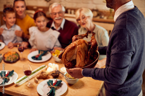 Close-up of man serves Thanksgiving turkey while having meal with his family at home.