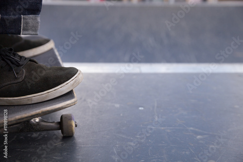 Closeup of man's foot on skateboard. skater riding a skateboard. view of a person riding on his skate.