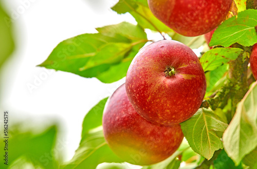 Closeup of many red apples growing on an apple tree branch in summer with copyspace. Fruit hanging from an orchard farm tree with bokeh. Sustainable organic agriculture in the peaceful countryside