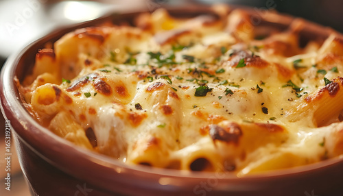 Close-up of melted cheesy pasta in a bowl at a restaurant