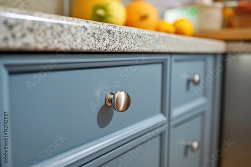 kitchen, cabinet, drawer, handle, grey, blue, modern, granite, countertop, fruit, interior, design, home, decor, apartment, house, furniture, storage, colours, style, metal, hardware, closeup, detail, finish, new, upgrade, decorating, contemporary, clean, smooth, ergonomic, functional, quality, hard-wearing, beautiful, fresh, elegant, stylish, compact, rustic, neutral, trendy, organised, efficient, space saving, home improvement