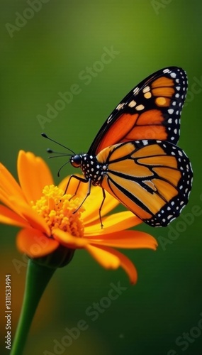 Close-up of monarch butterfly sipping nectar from bright orange petals , monarch butterfly, macro photography