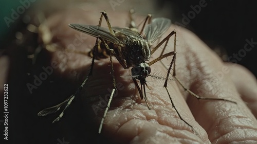 Close-Up of Mosquito Feeding on Human Skin in Natural Light