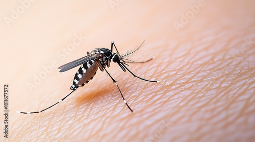 Close-up of mosquito resting on human skin, with clear area for text or descriptions.