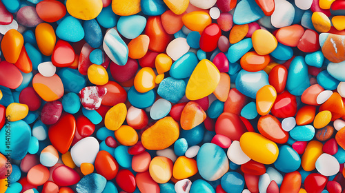 Close-up of multicolored smooth pebbles creating a seamless, vibrant pattern, ideal for nature-themed designs and backgrounds