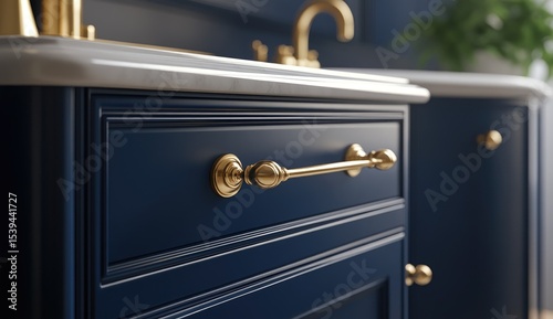 cabinetry, drawer, gold, hardware, marble, blue, kitchen, bathroom, countertop, modern, classic, elegant, detail, closeup, design, interior, luxury, furniture, handle, detail, storage, finish, wood, paneling, solid, glossy, contemporary, high-end, texture, light, image, rendering, three-dimensional, visual, perspective, architectural
