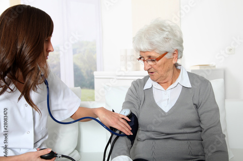 senior, elderly, woman, old woman, nurse, checking, check-up, stethoscope, instrument, measure, medical tool, blood pressure, homecare, medicine, doctor, health, missy, men at work, help, assistance, indoor, nursing home, smiling, caucasian