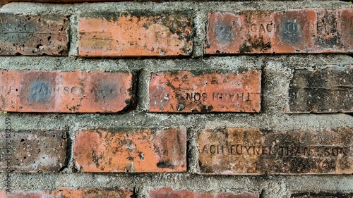 Close-up of old, weathered red bricks with text, highlighting historical architecture and urban decay concepts