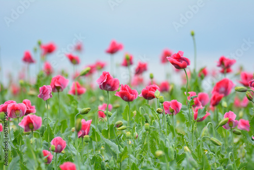 Close-up of Opium Poppy Field (Papaver somniferum) Summer, Germerode, Hoher Meissner, Werra Meissner District, Hesse, Germany