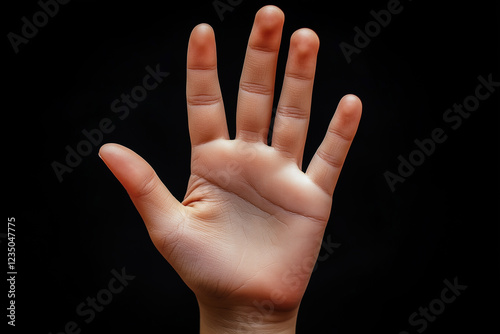Close-up of palm with five fingers spread showing number 5, waving or stop. Photo isolated on black background.A human hand on a black background
