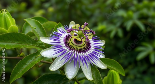 Close-Up of Passionflower with Unique Purple and White Petals in Garden