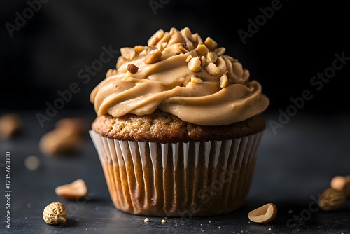 Close-up of peanut muffin with creamy peanut topping and nut garnish