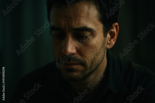 Close-up of pensive man in shadows, eyes downcast. Emotional and introspective mood. generative AI