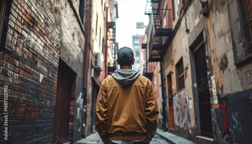 Close-Up of Person from Behind in Urban Alley – Streetwear Full-Width Composition