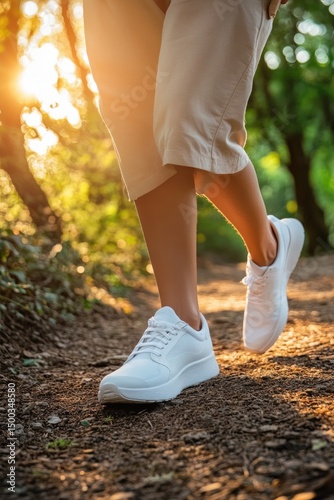 leg, sneaker, white, path, dirt, sunlight, tree, nature, walking, outdoors, exercise, fitness, hiking, shoe, person, travel, summer, activity, fresh, healthy, active, fresh air, movement, sunshine, warmth, comfort, light, sharpened, closeup, detail, earth, footwear, casual attire, sporty, activewear, trail, foot, ankle, sole, lace