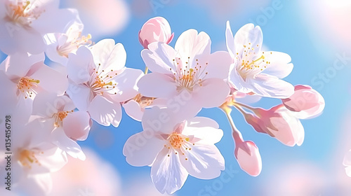 cherry blossom, flower, pink, white, bud, blue, sky, fresh, warm, romantic, detail, colours, background, tone, clear, spring, bloom, season