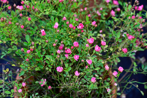 Close-up of pink blooming rosa in a garden pot, showcasing vibrant blossoms and lush green foliage.