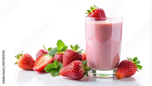 Close-up of pink strawberry smoothie in glass with strawberries isolated on white background