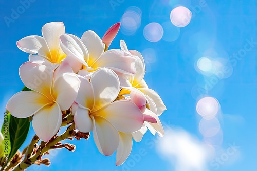 plumeria, flower, blossom, white, yellow, pink, flower petals, tropical, nature, beauty, vibrant, sky, blue, sunlight, bokeh, closeup, detail, macro, delicate, colourful, flora, plant, garden, summer, paradise, exotic, fresh, blooming, light, bright, sunny, closeup, flower, natural, high-coloured, freshness, spring, decoration