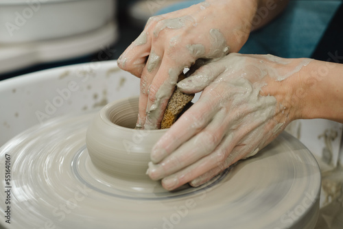 Closeup of potter hands working on pottery wheel in ceramic studio with clay hands side view with pottery wheel in motion