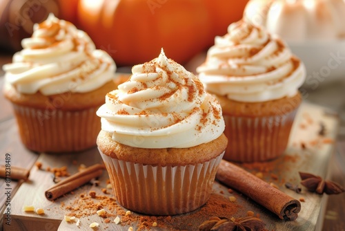 Closeup of Pumpkin Spice Cupcake, Autumn Dessert, Festive Baking, Whipped Cream Frosting, Cinnamon and Nutmeg