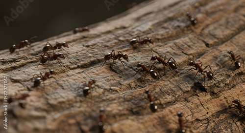 ant, red, small, crawling, wooden, log, rough, natural, lighting, earthy, nature, pest, control, macro, closeup, detail, insect, colony, foraging, creature, organic, environment, biology, animal, species, wildlife, ground