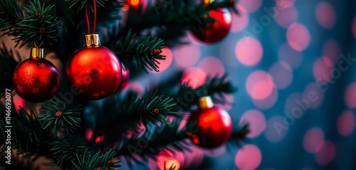 Closeup of Red Christmas Ornaments Adorning a Festive Christmas Tree with a Blurry Background of Sparkling Lights