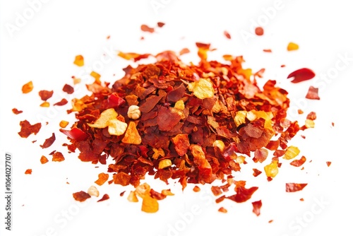 Close-up of red pepper flakes scattered on white background. Vibrant red flakes small, irregularly shaped. Slightly elevated angle gives depth, perspective. Randomly scattered flakes create chaotic