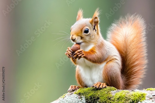 closeup, red, squirrel, holding, acorn, perched, moss-covered, tree branch, blurred, forest, background, ample, copy space, text, branding, art, design, creative, texture, abstract, visual, colours, sharpened, inspiration, professional, unique, high-quality, composition, detail, scene, modern, simplicity, concept, style, empty space, minimal