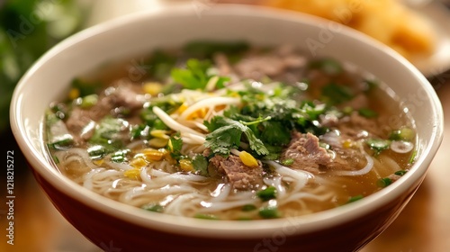 Close-up of rice and Vietnamese pho with beef and herbs in a traditional Vietnamese bowl, emphasizing fragrant and flavorful qualities. Ideal for Vietnamese cuisine and comforting soups.