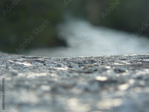 close-up of rock surface near stream with bokeh highlights in foreground, shallow depth of field