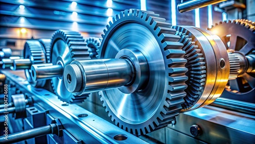 Close-up of rotating factory machinery part, blurred motion effect, industrial equipment, metal gears, shaft, and bolts, with a hint of motion blur and shadows.