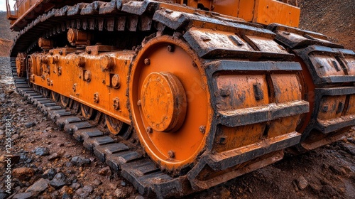 machinery, track, heavy, construction, industrial, mining, equipment, wheel, rust-eaten, orange, dirt, ground, rock, crawler, vehicle, powerful, metal, shoveling, site, closeup, detail, work, machine, tough, terrain