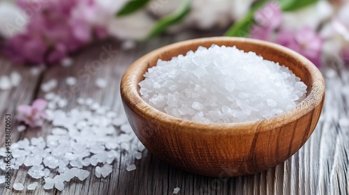 Close-up of sea salt crystals in a wooden bowl, with blurred pink flowers in the background, creating a spa-like atmosphere. : Generative AI