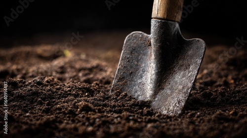 Close-up of Shovel in Rich Brown Soil, Gardening and Agriculture Concept with Dark Background