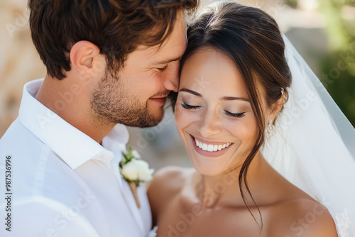 Close-Up of Smiling Bride and Groom Embracing on Wedding Day