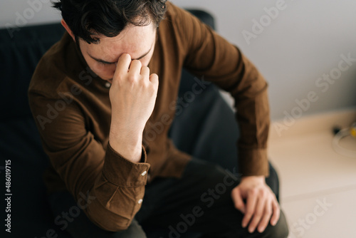 Close-up of stressed young man sitting alone feeling sad worry regret or fear, holding hand on forehead, depressed and desperate home. Suffering emotional pain and unhappy, mental health.